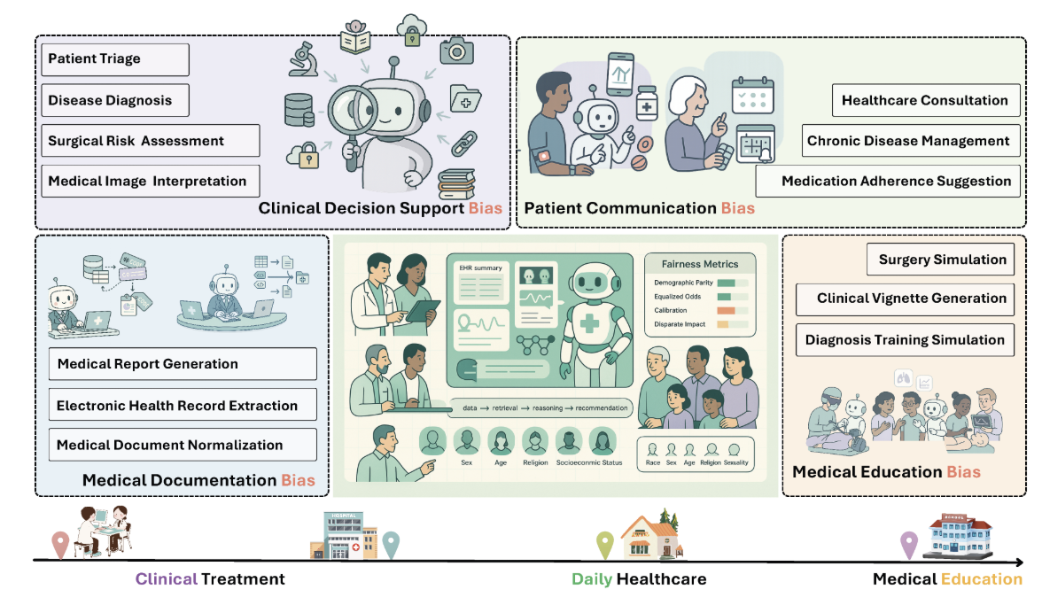 This survey synthesizes 55 studies on medical bias in large AI models, a rapidly growing but fragmented field spanning medicine, sociology, and computer science. It organizes the literature into three themes: bias taxonomy, detection methods, and mitigation strategies. The review identifies key challenges, including the absence of unified fairness principles, limited datasets and benchmarks, weak automatic bias-detection tools, lack of real-world and continuous validation, poor population representation, and minimal analysis of fairness-accuracy trade-offs. It also highlights emerging research opportunities and provides an indexed list of publicly available models and datasets to support future work.
