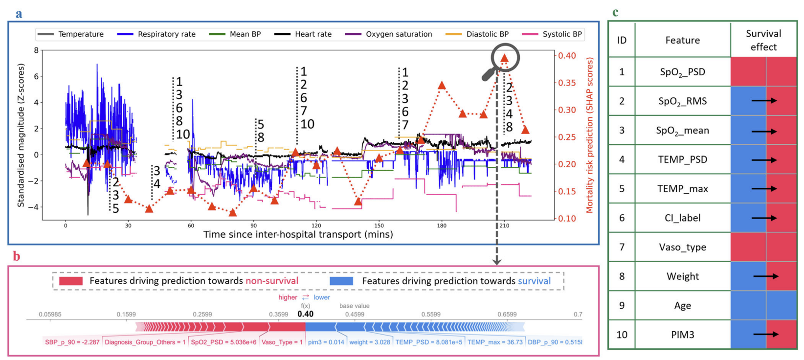 The study introduces PROMPT, an explainable machine-learning pipeline that predicts real-time 30-day mortality risk for critically ill children during inter-hospital transport to PICUs. Using continuous vital-sign time series, EHR data, and transport-specific information, PROMPT outperforms the conventional PIM3 score, with random forest and logistic regression models achieving AUROC up to 0.83. The system provides dynamic, patient-specific risk updates and SHAP-based explanations, helping clinicians identify deterioration during transport. This work demonstrates the feasibility of real-time, interpretable AI decision support in mobile paediatric critical care.