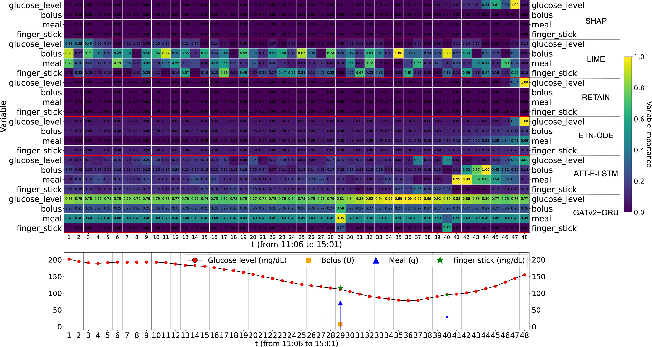 The state of the art of blood glucose prediction has been achieved by leveraging advanced deep learning methods to model multimodal data, i.e., sensor data and self-reported event data, organized as multi-variate time series (MTS). However, these methods are mostly regarded as “black boxes” and not entirely trusted by clinicians and patients. In this paper, we propose interpretable graph attentive recurrent neural networks (GARNNs) to model MTS, explaining variable contributions via summarizing variable importance and generating feature maps by graph attention mechanisms instead of post-hoc analysis.