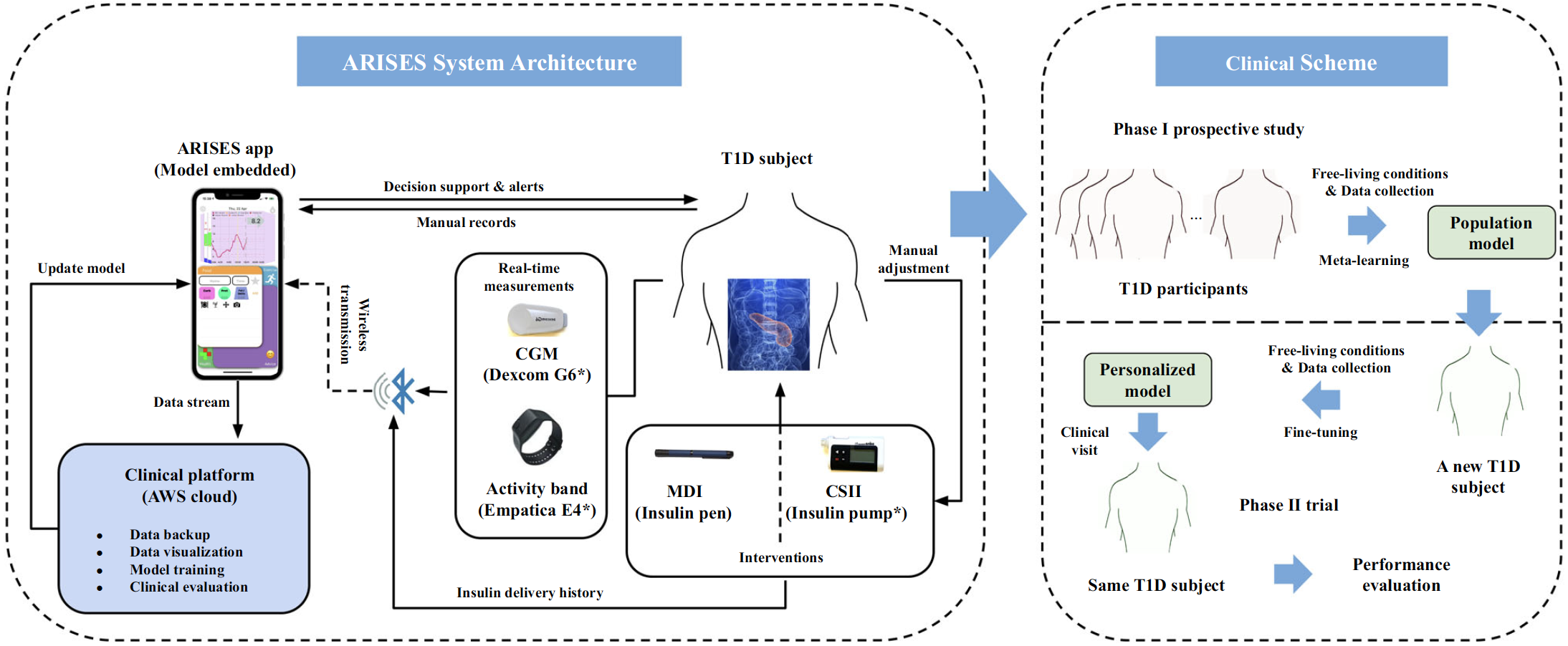 Applying a mixed effects logistic regression analysis to the outcomes of a six-week longitudinal study in 12 type 1 diabetes (T1D) adults using CGM and a clinically validated wearable sensor wristband (NCT ID NCT03643692), we identified several significant associations between physiological measurements and hypo- and hyperglycemic events measured an hour later. We proceeded to develop a new smartphone-based platform, ARISES (Adaptive, Real-time, and Intelligent System to Enhance Self-care), with an embedded deep learning algorithm utilizing multi-modal data from CGM, daily entries of meal and bolus insulin, and the sensor wristband to predict glucose levels and hypo- and hyperglycemia.