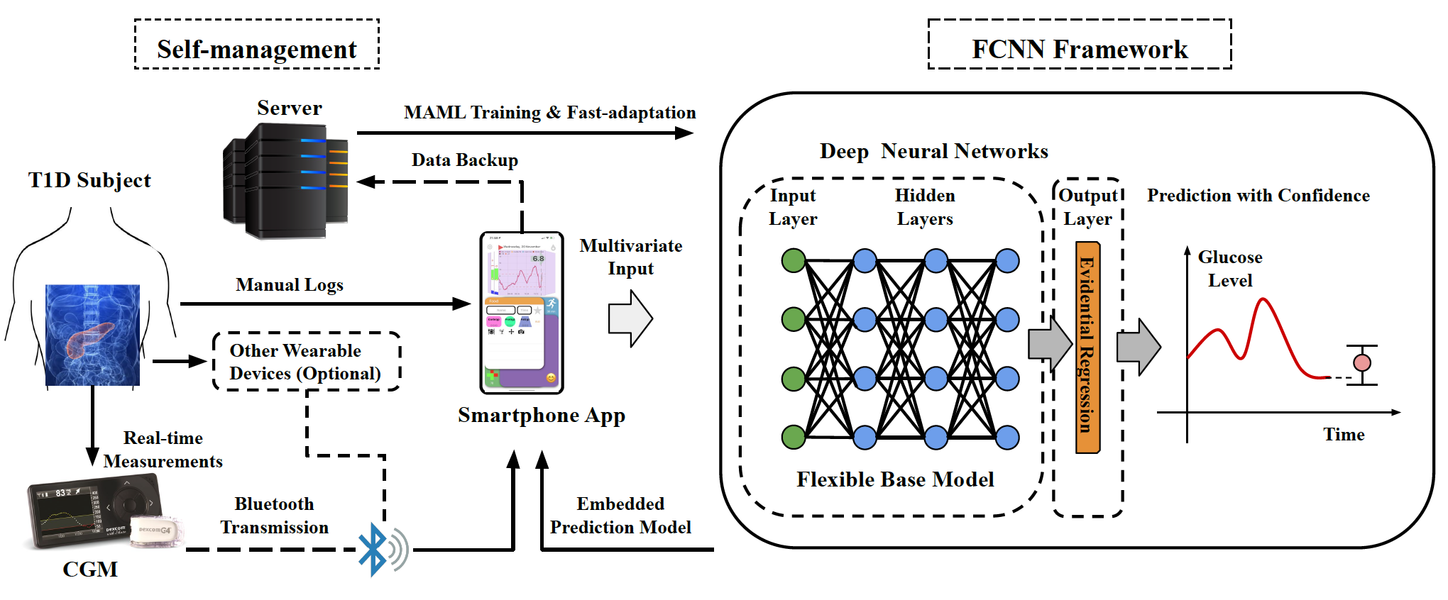 We propose a novel deep learning framework, Fast-adaptive and Confident Neural Network (FCNN). An attention-based recurrent neural network is used to learn representations from contiuous glucose monitoring input and forward a weighted sum of hidden states to an evidential output layer, aiming to compute personalized BG predictions with theoretically supported model confidence. The model-agnostic meta-learning is employed to enable fast adaptation for a new T1D subject with limited training data.