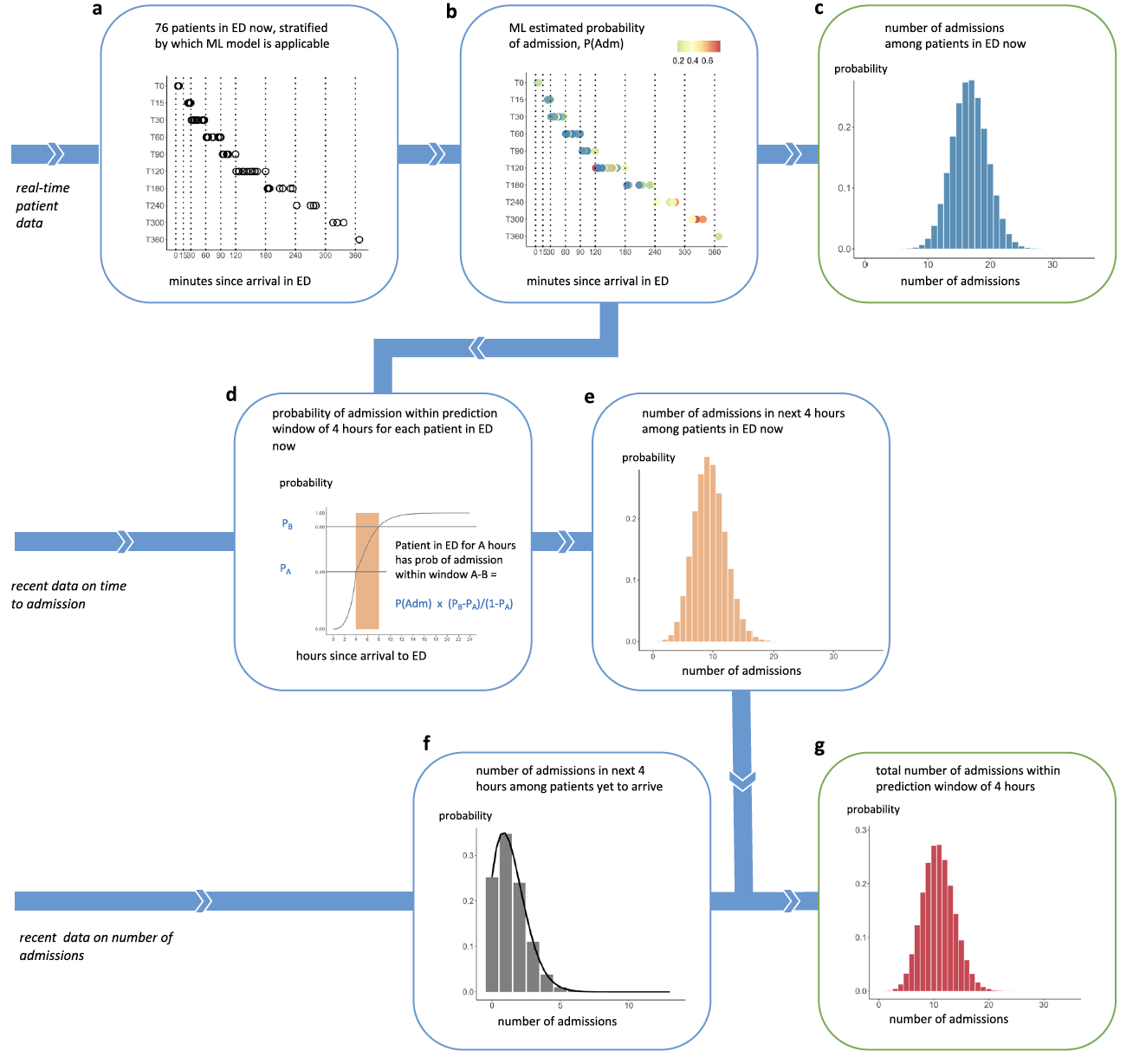 Machine learning for hospital operations is under-studied. We present a prediction pipeline that uses live electronic health-records for patients in a UK teaching hospital’s emergency department (ED) to generate short-term, probabilistic forecasts of emergency admissions. A set of XGBoost classifiers applied to 109,465 ED visits yielded AUROCs from 0.82 to 0.90 depending on elapsed visit-time at the point of prediction. Patient-level probabilities of admission were aggregated to forecast the number of admissions among current ED patients and, incorporating patients yet to arrive, total emergency admissions within specified time-windows.